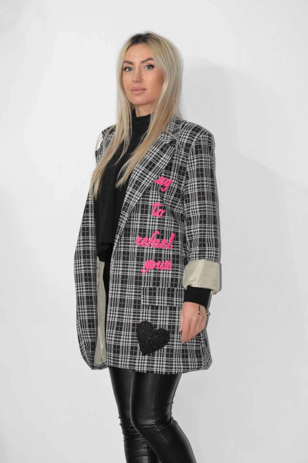 Sacoul casual drept cu imprimeu este realizat dintr-o țesătură în carouri în nuanțe de gri, negru și alb, fiind ideal atât pentru o ținută casual, cât și pentru una formală.