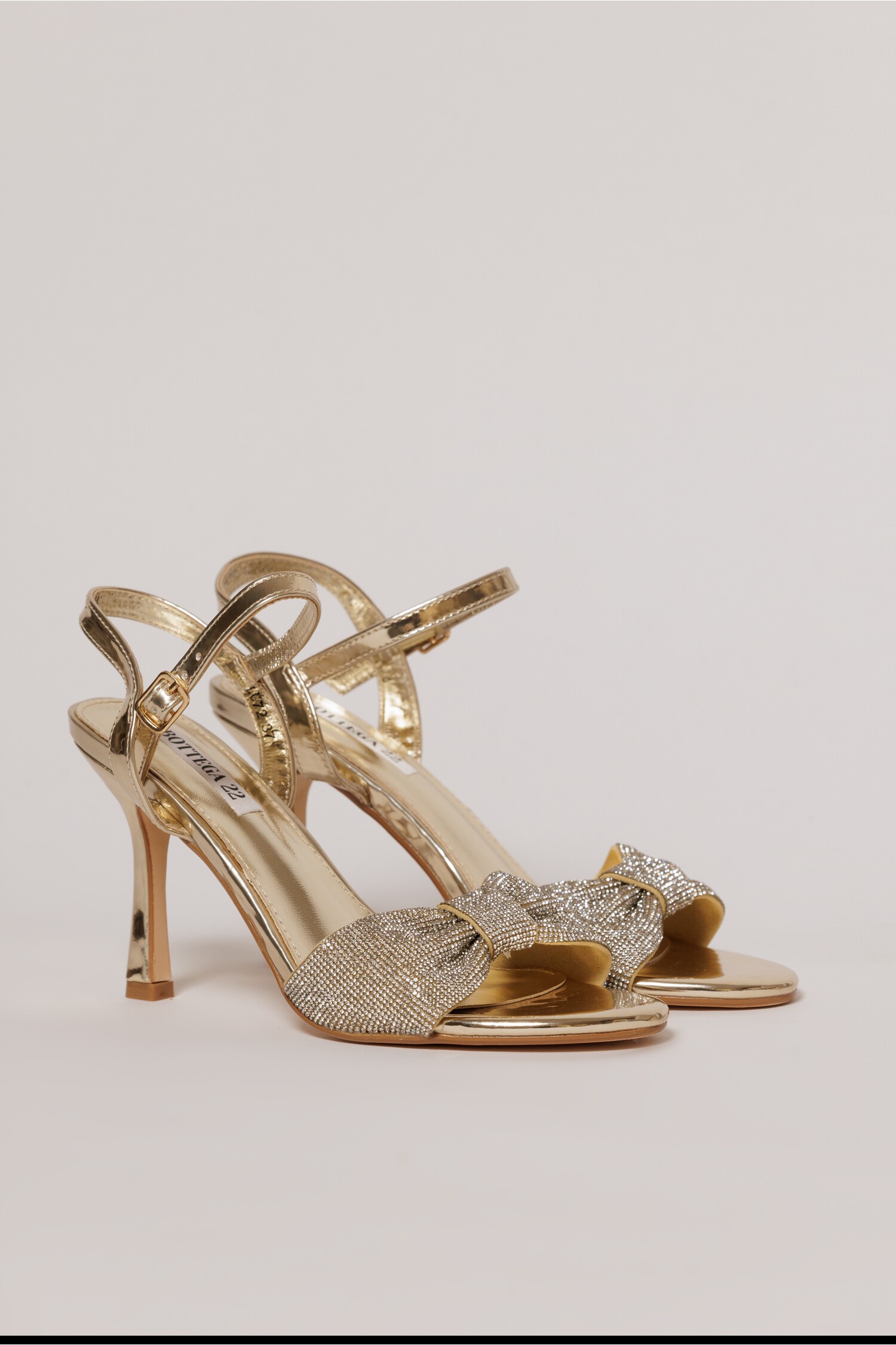 Sandale aurii cu funda strălucitoare, toc subțire de 9 cm, ideale pentru evenimente speciale. Alege eleganța și confortul!