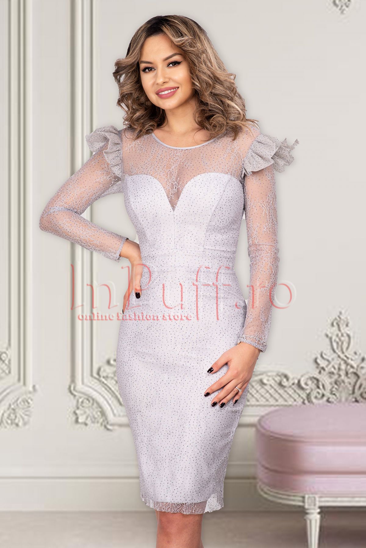 Rochia gri de ocazie cu sclipici este alegerea perfectă pentru evenimente speciale.