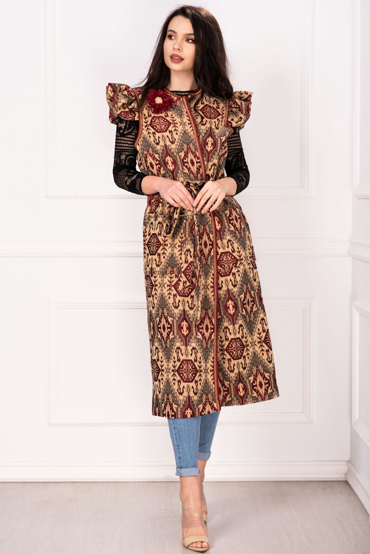 Vesta de primăvară cu motive etnice și floare 3D este alegerea perfectă pentru un look elegant și lejer.