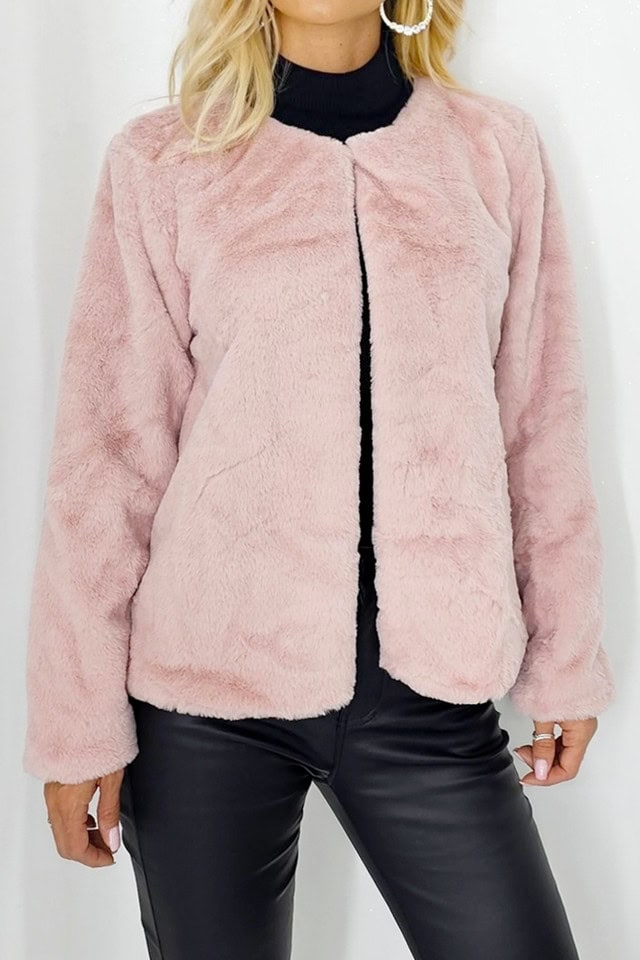 Haina elegantă din blană ecologică Paula, croi larg, roz pal, mărime S/M. Perfectă pentru un look sofisticat! Alege stilul tău acum!