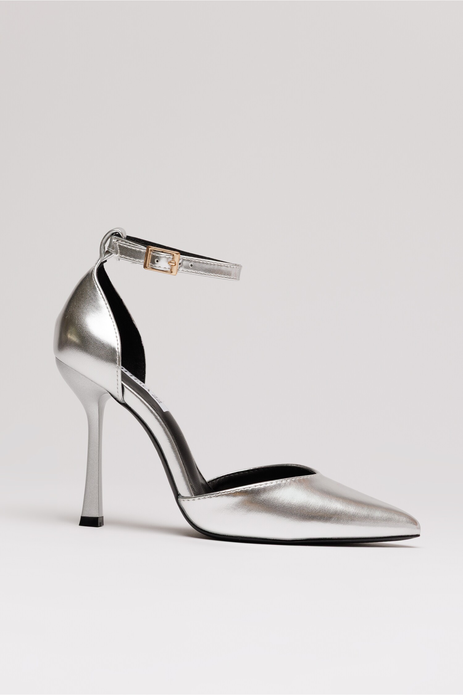 Pantofi eleganți argintii din piele ecologică, cu vârf ascuțit și bareta reglabilă. Ideal pentru evenimente formale. Alege stilul!
