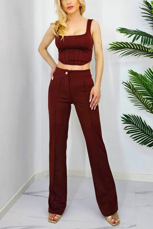 Reducere 36% – Compleu elegant Allan, top cu decolteu simetric, cusaturi evidentiate si pantaloni evazati, Maro