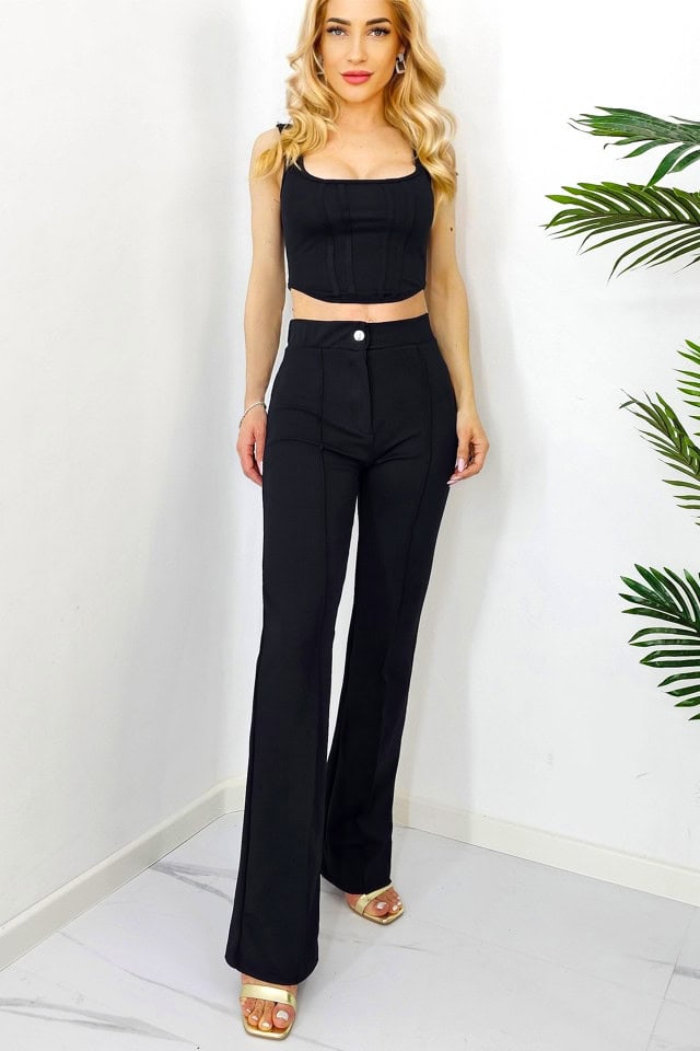 Reducere 36% – Compleu elegant Allan, top cu decolteu simetric, cusaturi evidentiate si pantaloni evazati, Negru