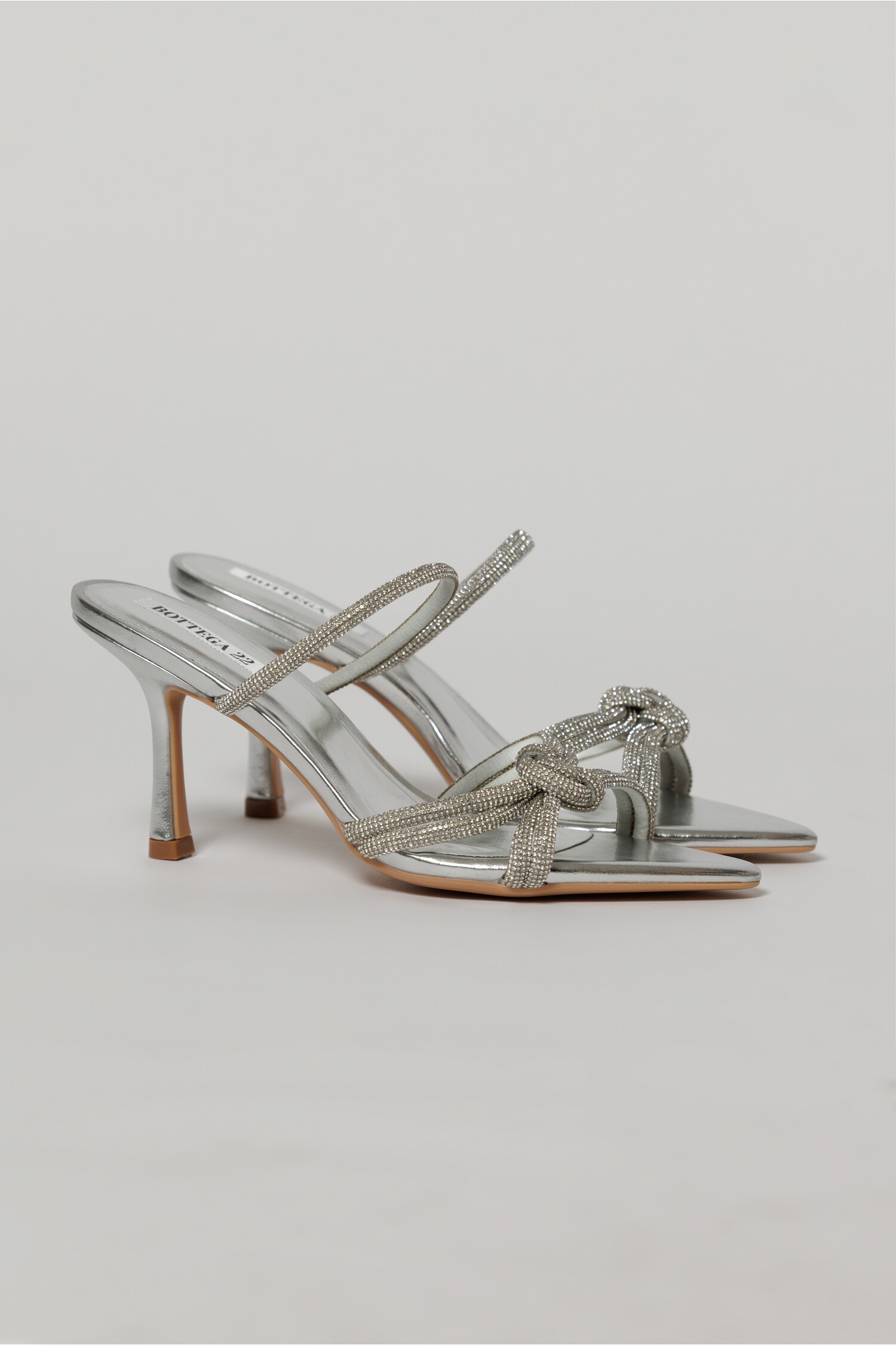 Sandalele elegante argintii cu varf ascutit și barete decorate cu pietricele stralucitoare sunt alegerea perfectă pentru orice ocazie specială.
