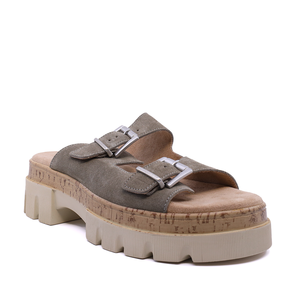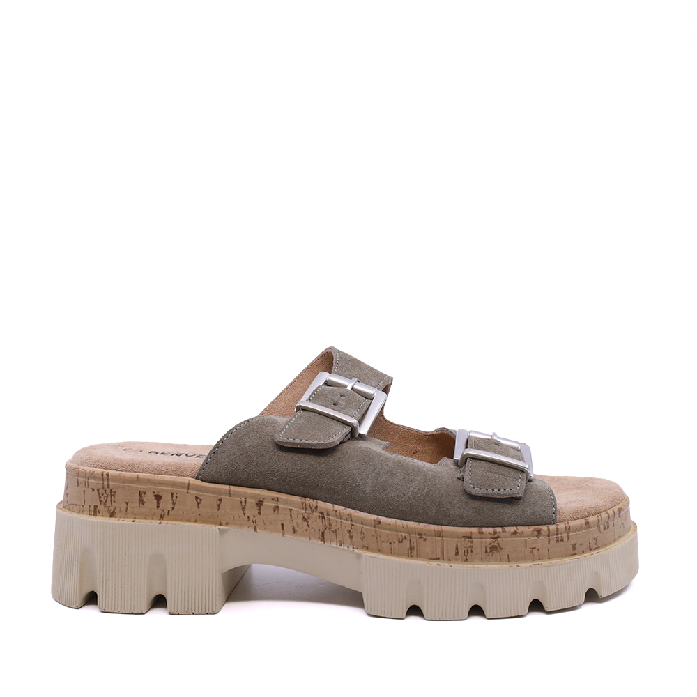 Descoperă saboții chunky Benvenuti din piele întoarsă verde kaki, confortabili și stilati, ideali pentru uz zilnic. Alege confortul!