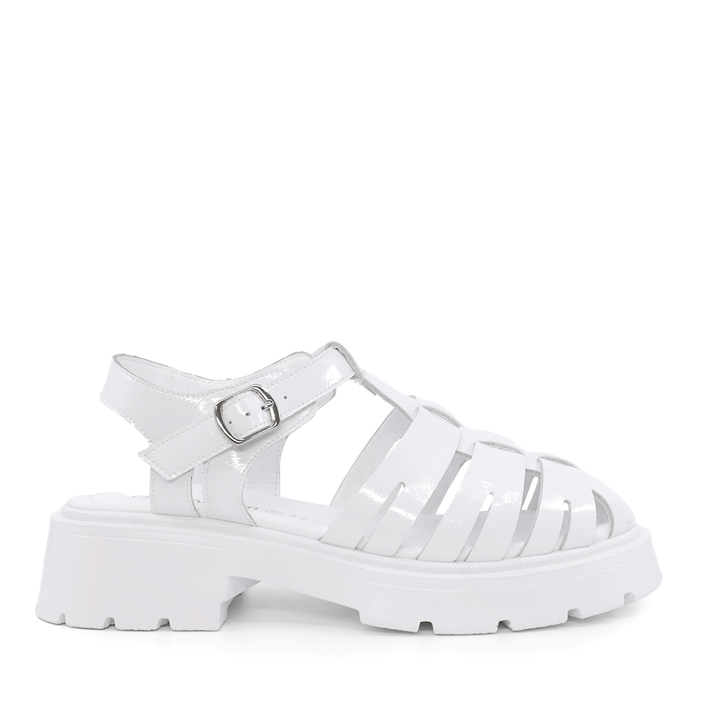 Realizate din piele naturală lăcuită, aceste sandale albe oferă o notă de rafinament oricărei ținute de vară.