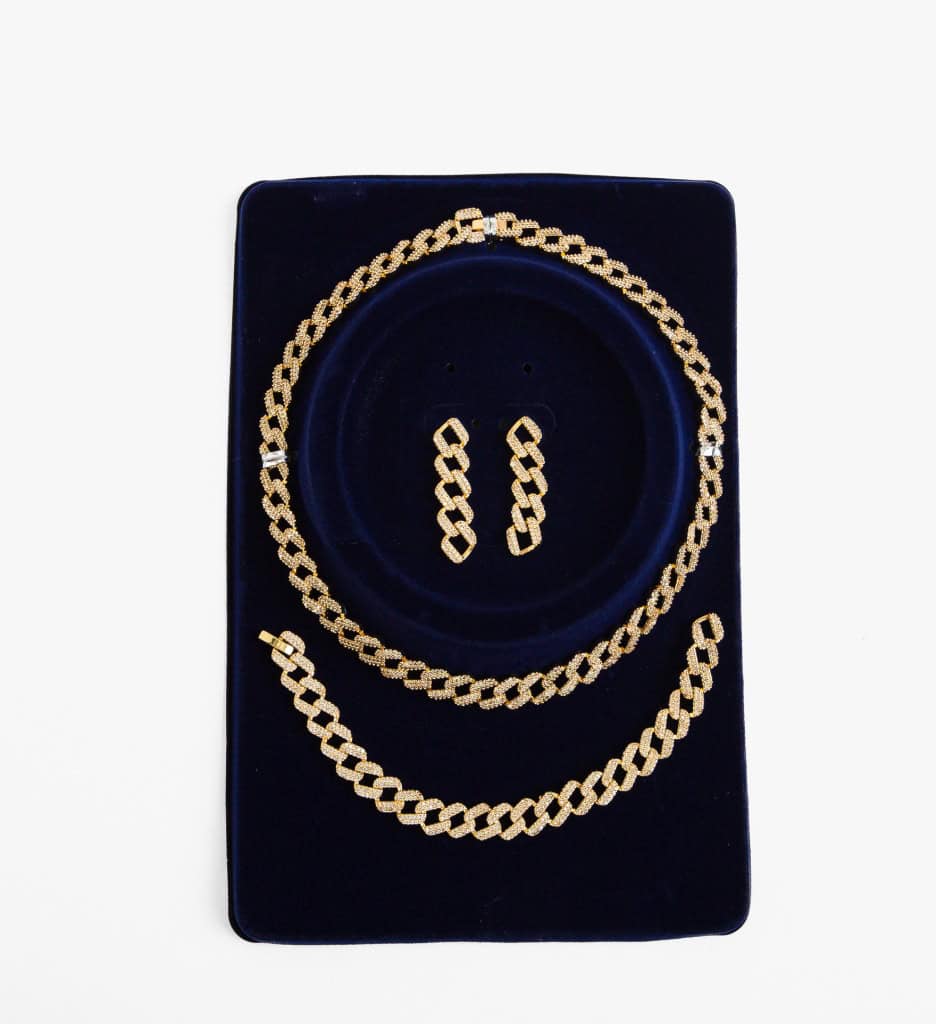 Fabricat din materiale de calitate superioară, acest set include cercei și un colier, ambele având un finisaj auriu strălucitor.