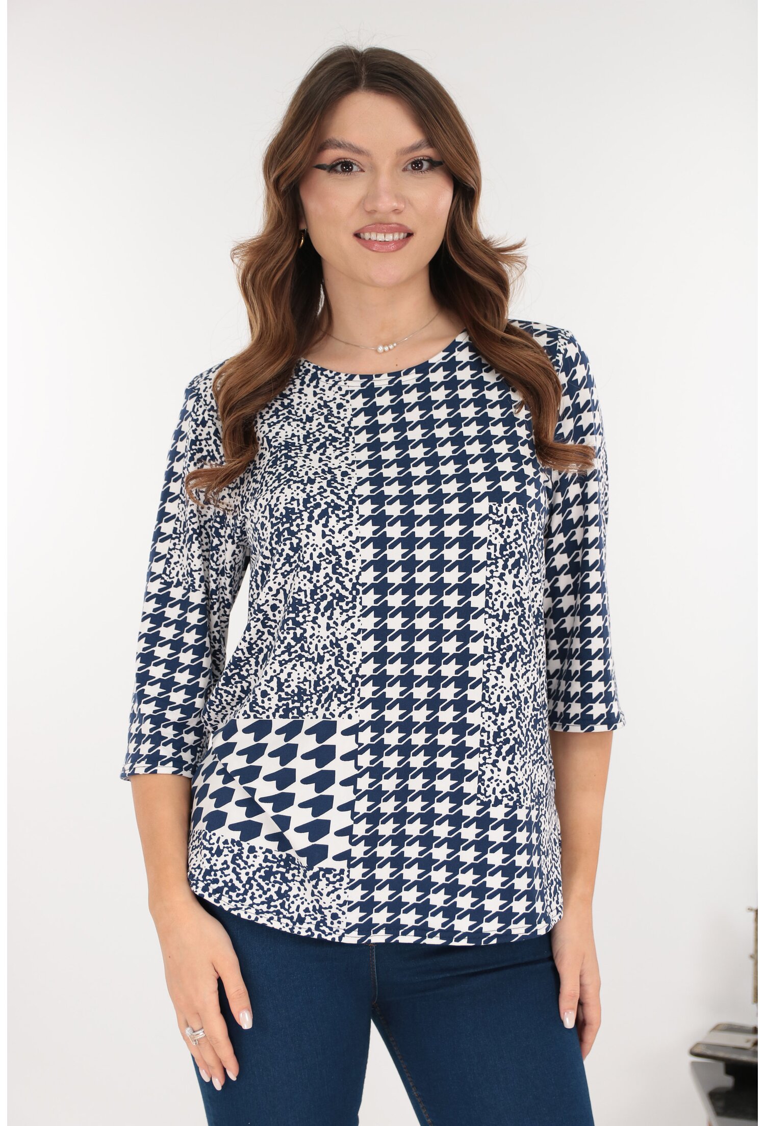 Bluza din bumbac cu print geometric albastru-alb, confortabilă și lejeră, ideală pentru zilele de vară. Alege stilul modern!