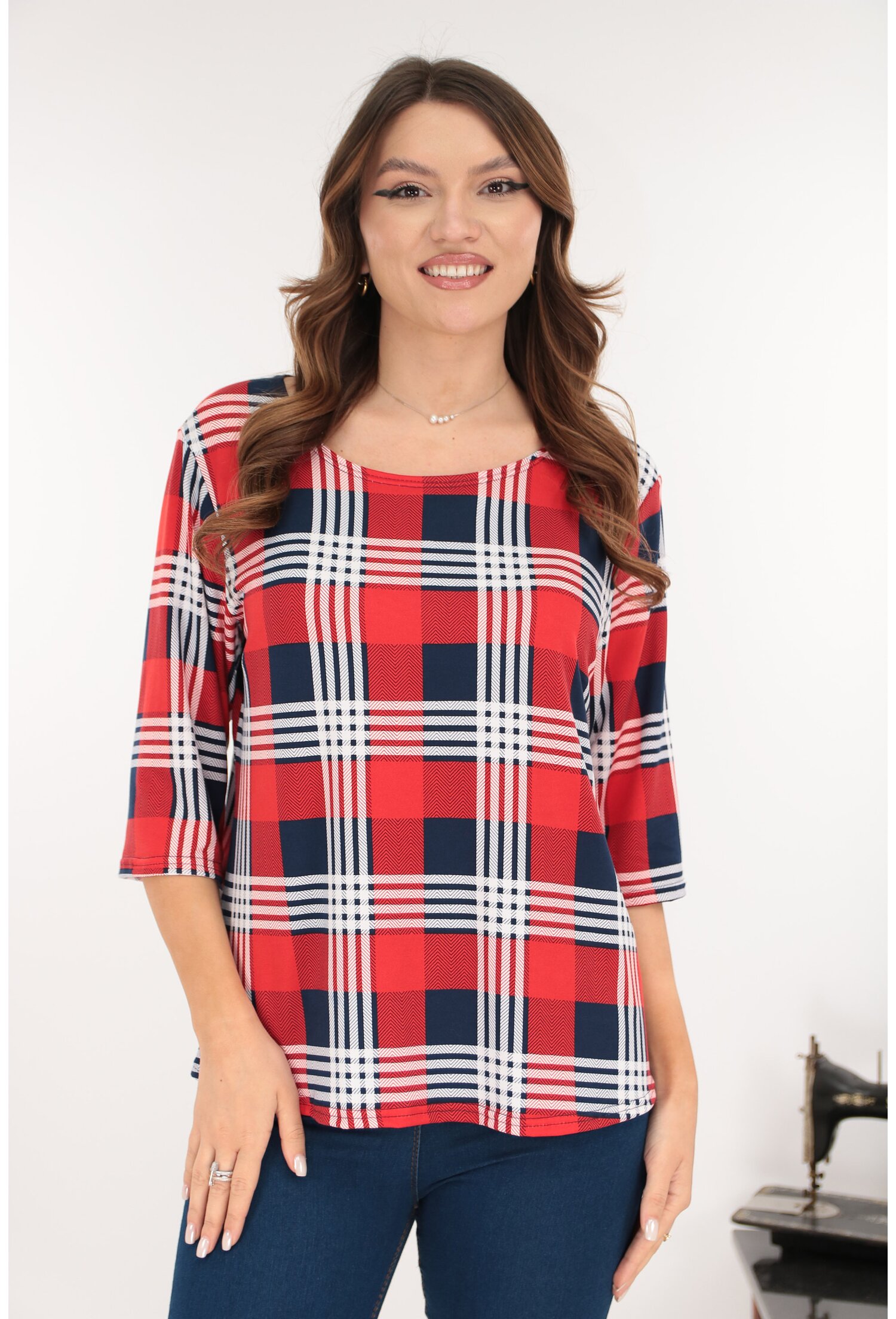 Bluza rosie din bumbac cu print geometric bleumarin-alb, confortabilă și elegantă. Perfectă pentru uz zilnic. Alege stilul!