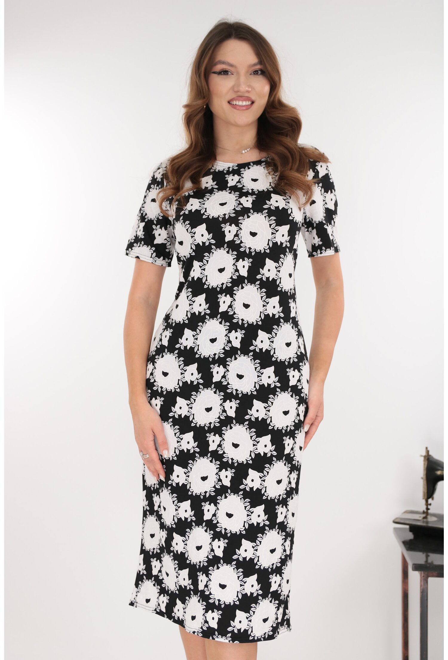 -Rochie midi neagra cu print floral alb -Confectionata din tesatura elastica, fina (jerse fin) -Croiala dreapta -Decolteu rotund -Maneci scurte