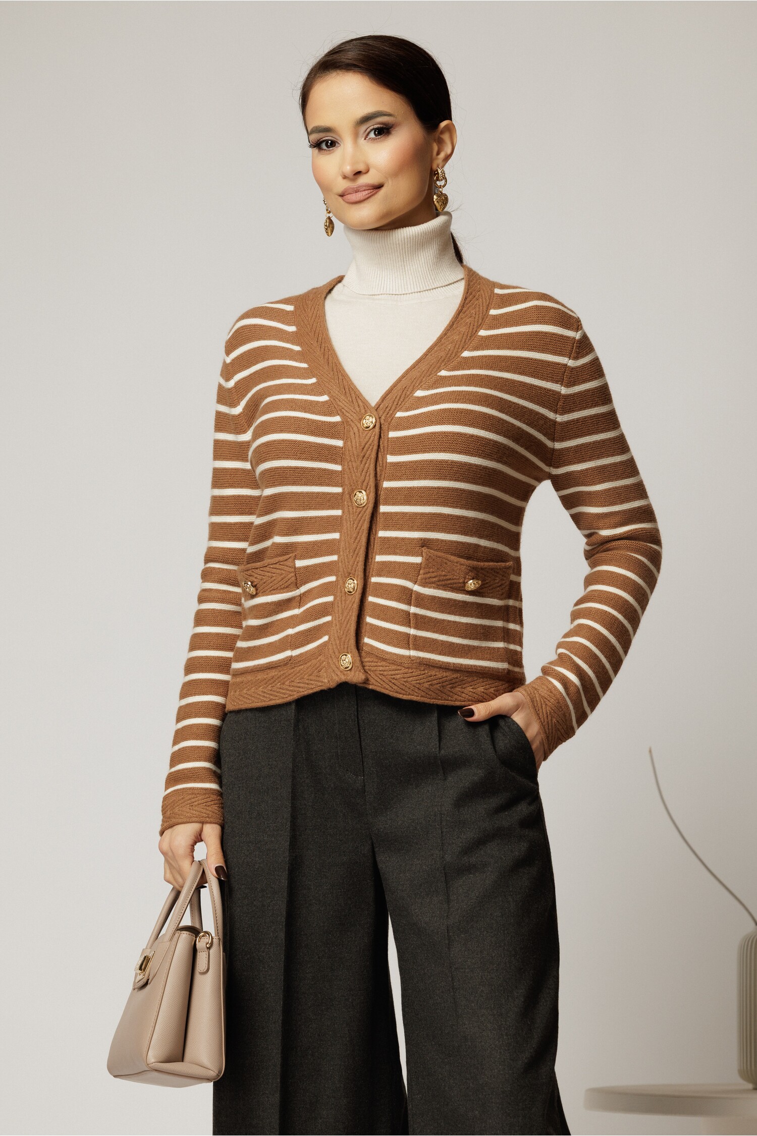 Pulover elegant maro cu dungi albe, ușor de asortat. Închidere cu nasturi și buzunare, perfect pentru uz zilnic. Alege stilul și confortul!