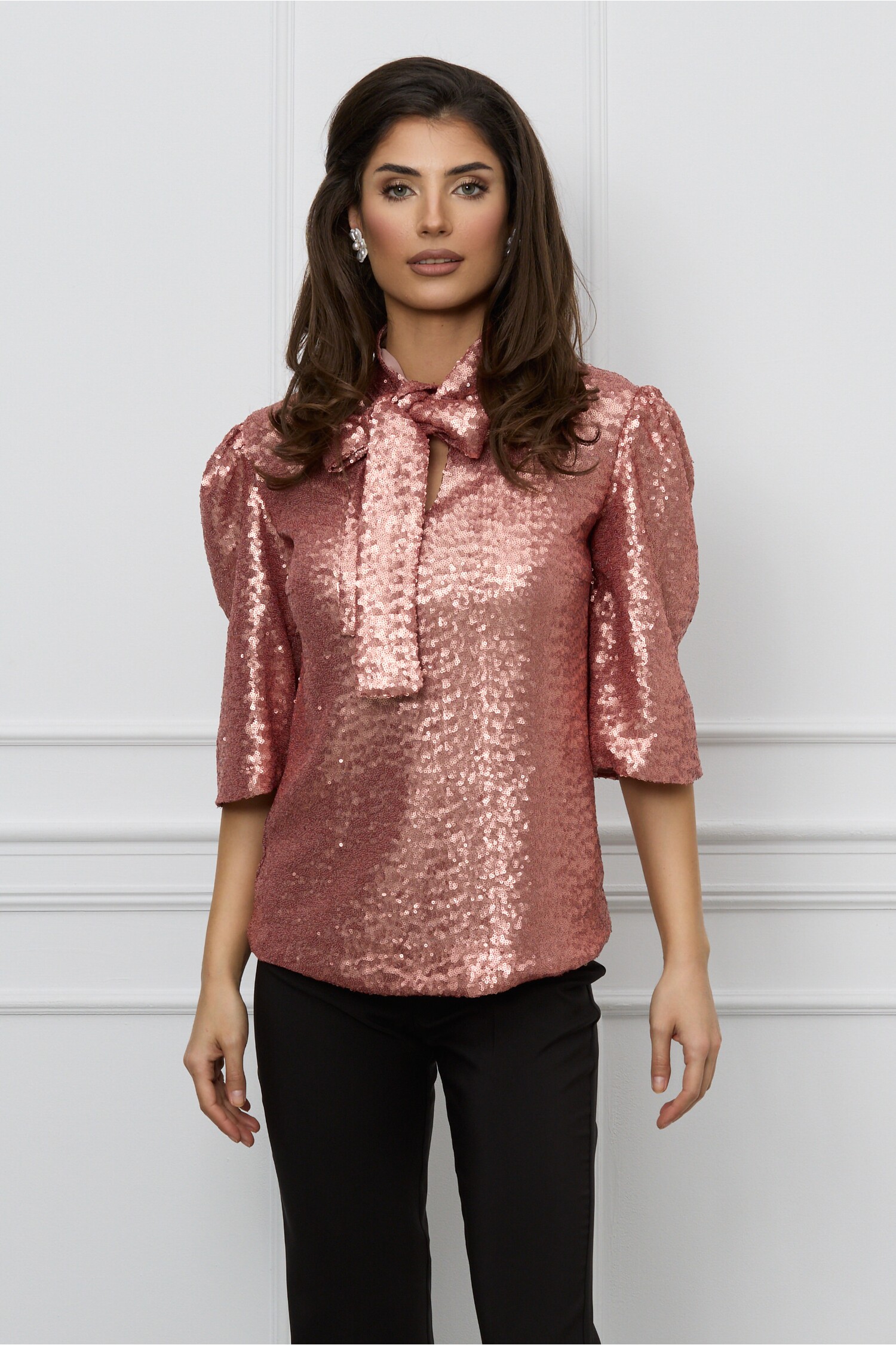 Reducere 60% – Bluza Dy Fashion rose din paiete cu funda la guler
