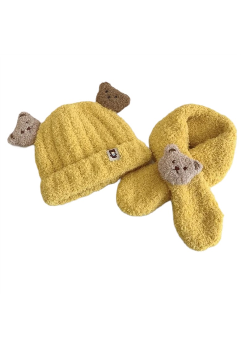 Reducere 63% – Set Caciula si Fular Model Ursuleti – Acril – Baieti – Galben Mustar