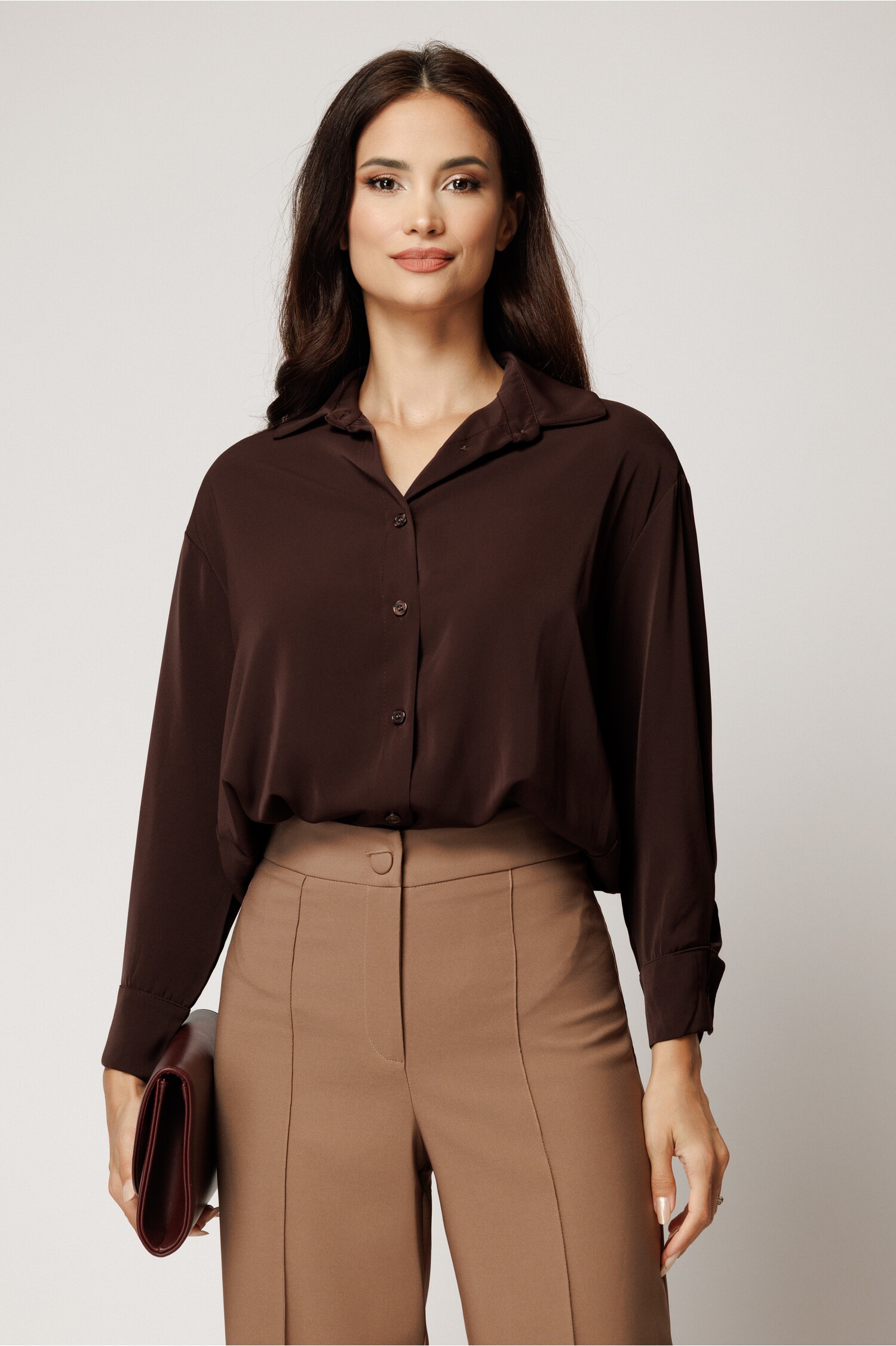 Camasa maro din voal satinat, cu guler ascutit si maneci lungi. Perfecta pentru birou sau ocazii speciale. Alege stilul elegant!