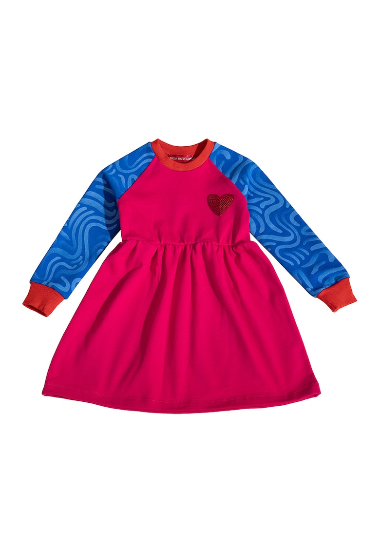 Rochia cu croiala A și maneci contrastante în nuanțe de fucsia și albastru este alegerea perfectă pentru un stil casual și modern.