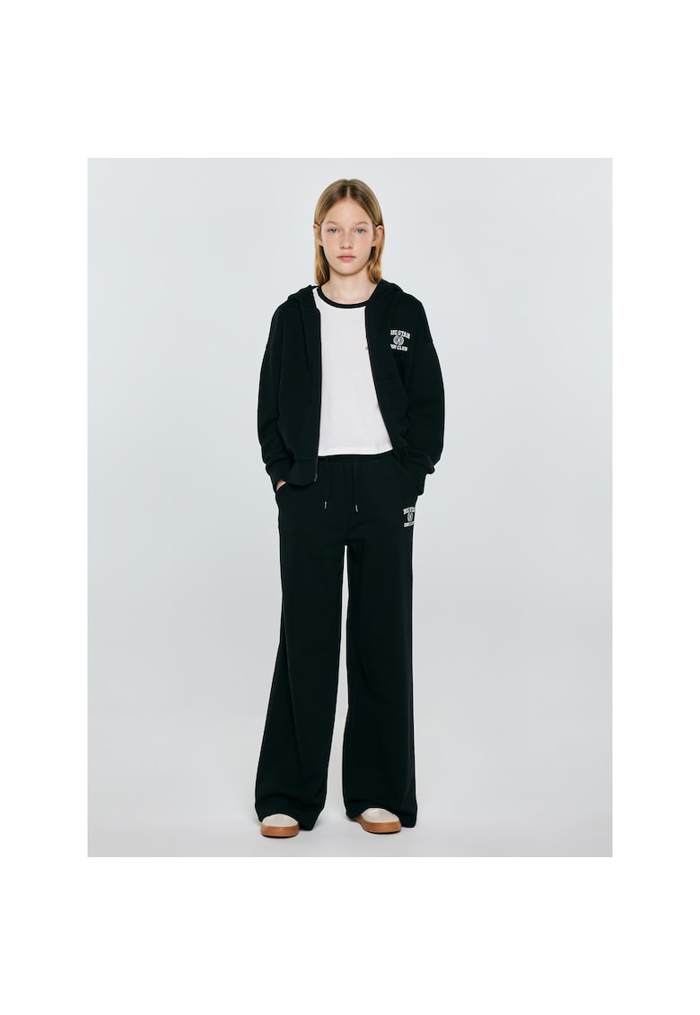 Acești pantaloni lungi, de culoare neagră, sunt confecționați dintr-un material textil de calitate, oferind un confort optim pe parcursul întregii zile.