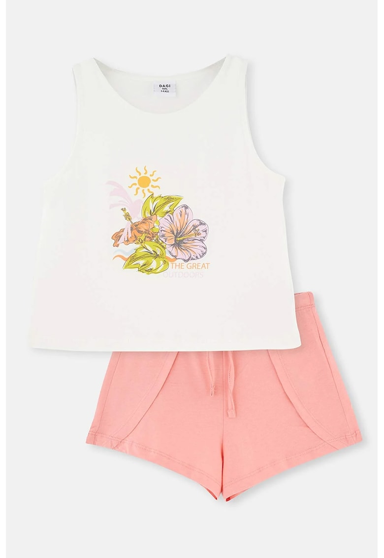 Această pijama confortabilă include un top fără mâneci și pantaloni scurți, realizată din bumbac 100%, care asigură o senzație plăcută pe piele.