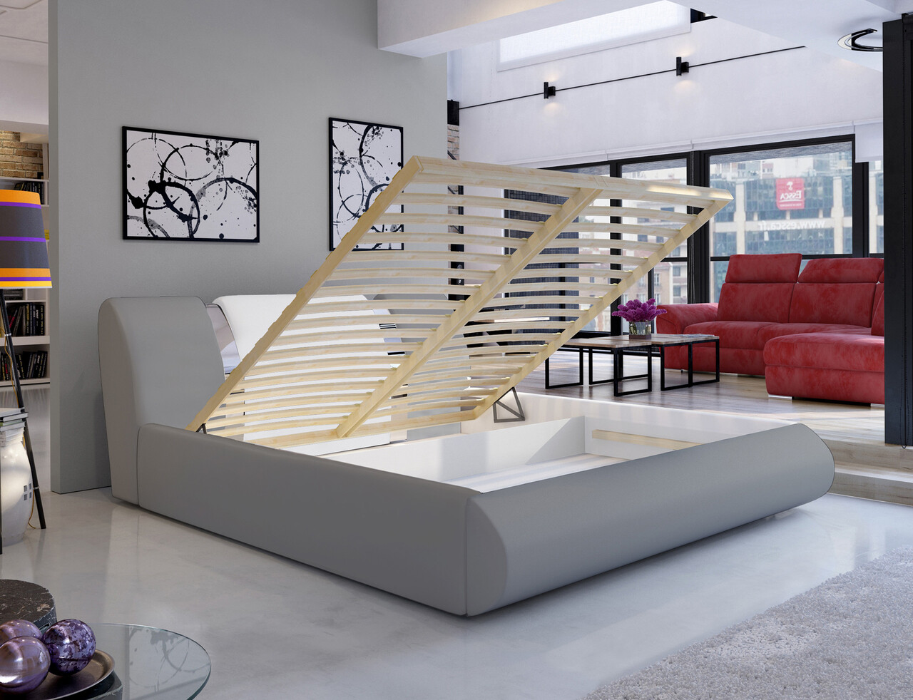Reducere 8% – Pat tapitat cu somiera si lada depozitare, 180×200 cm, ELTAP, Flavio, lemn/poliester, gri/alb