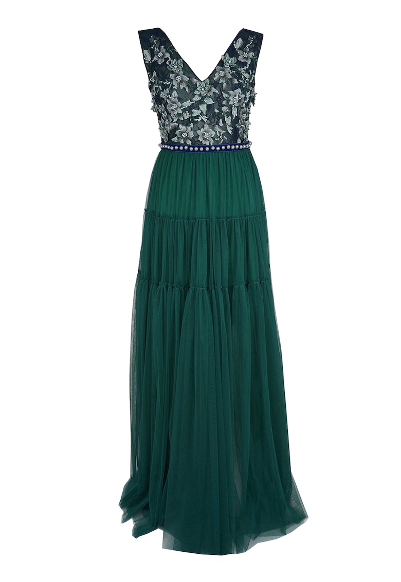 Reducere 85% – Rochie maxi stratificata cu motive florale brodate – Verde inchis