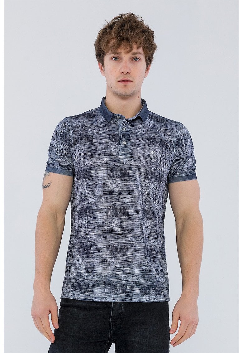 Tricoul polo cu imprimeu în nuanțe de alb și bleumarin este alegerea perfectă pentru un look casual și modern.