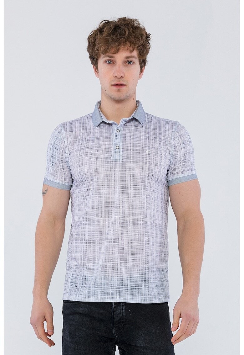 Tricou polo în carouri alb/albastru prafuit, din bumbac și poliester. Perfect pentru un look casual și confortabil. Alege stilul!