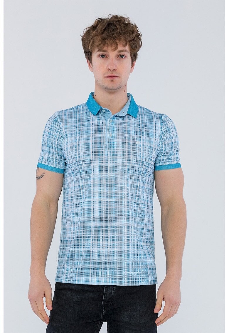 Tricou polo alb/turcoaz cu imprimeu carouri, confortabil și elegant. Ideal pentru zilele călduroase. Alege stilul casual!
